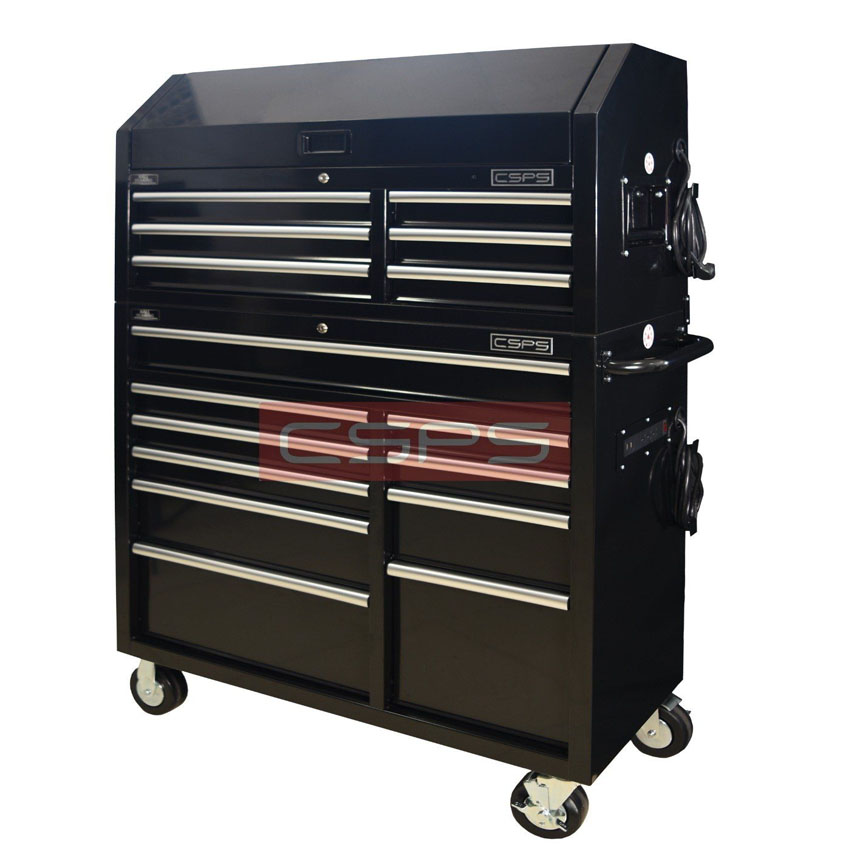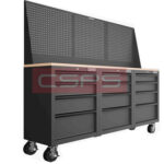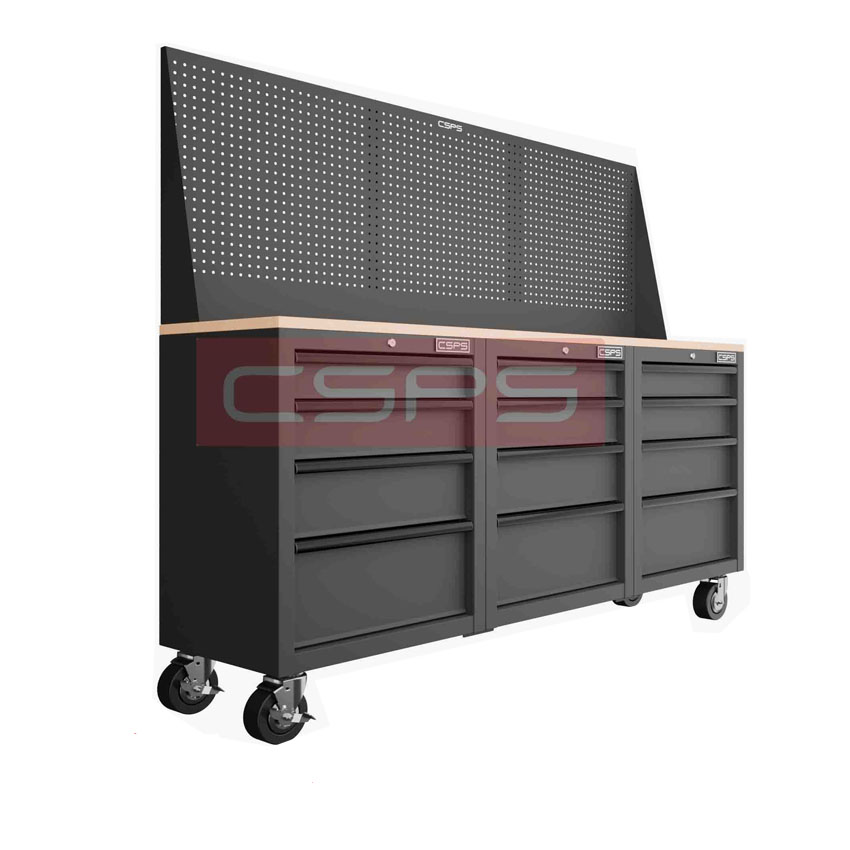 Bộ 3 Tủ dụng cụ CSPS 183cm 12 hộc màu đen mặt ván gỗ kèm vách lưới,Tủ dụng cụ CSPS 76cm – 07 hộc kéo có bánh xe di chuyển. Đây là kệ đồ nghề đa năng tủ dụng cụ là thiết bị dùng để lưu trữ bản vẻ xây dựng, bảo quản dụng cụ đồ nghề được sử dụng phổ biến tại các tiệm sửa xe máy, gara ô tô hoặc cho nhà máy, xí nghiệp hiện nay.