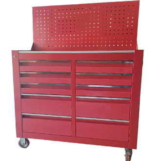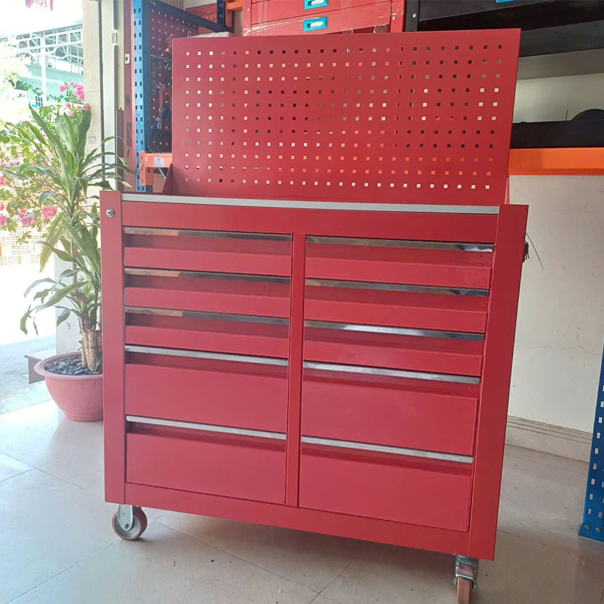 Tủ dụng cụ 10 ngăn kéo kết hợp bảng treo, có bánh xe tiện di chuyển. Đây là loại tủ đựng đồ nghề thông dụng và được sử dụng nhiều trong các tiệm sửa chữa xe máy hay trung tâm bảo dưỡng, bảo trì ô tô hoặc tại các nhà máy, xưởng sản xuất. Tủ được gia công chắc chắn và lắp rắp tại Việt Nam.