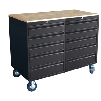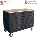 Tủ dụng cụ 10 ngăn, Tủ đồ nghề 10 ngăn có bánh xe di chuyển, nắp tủ được thiết kế ván gỗ ( đây là dòng tủ đồ nghề có sự kết hợp bàn nguội tại NPRO). Tủ được sử dụng phổ biến trong các nhà máy, xí nghiệp, tiệm sửa chữa xe máy, gara ô tô.
